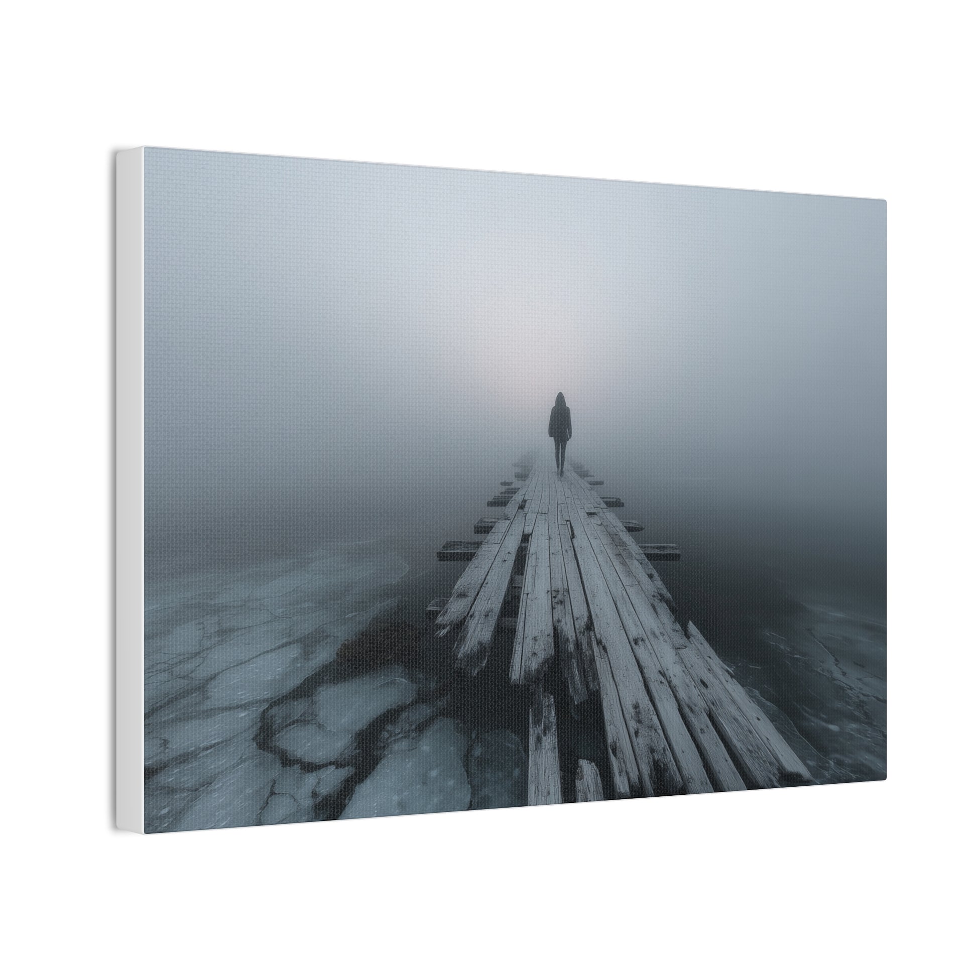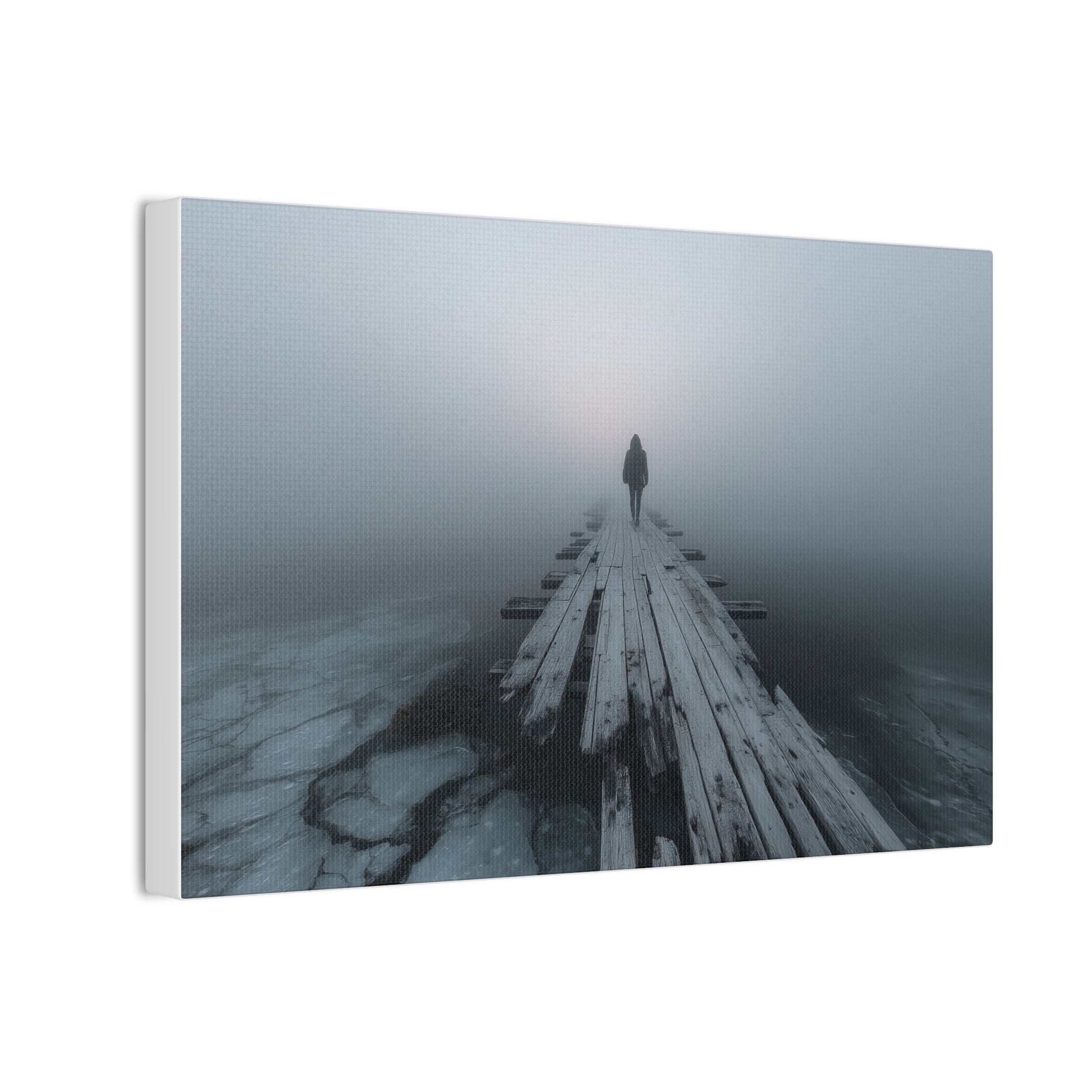Foggy Pier Canvas Art — Solitary Figure, Dreamlike Minimalist Wall Décor