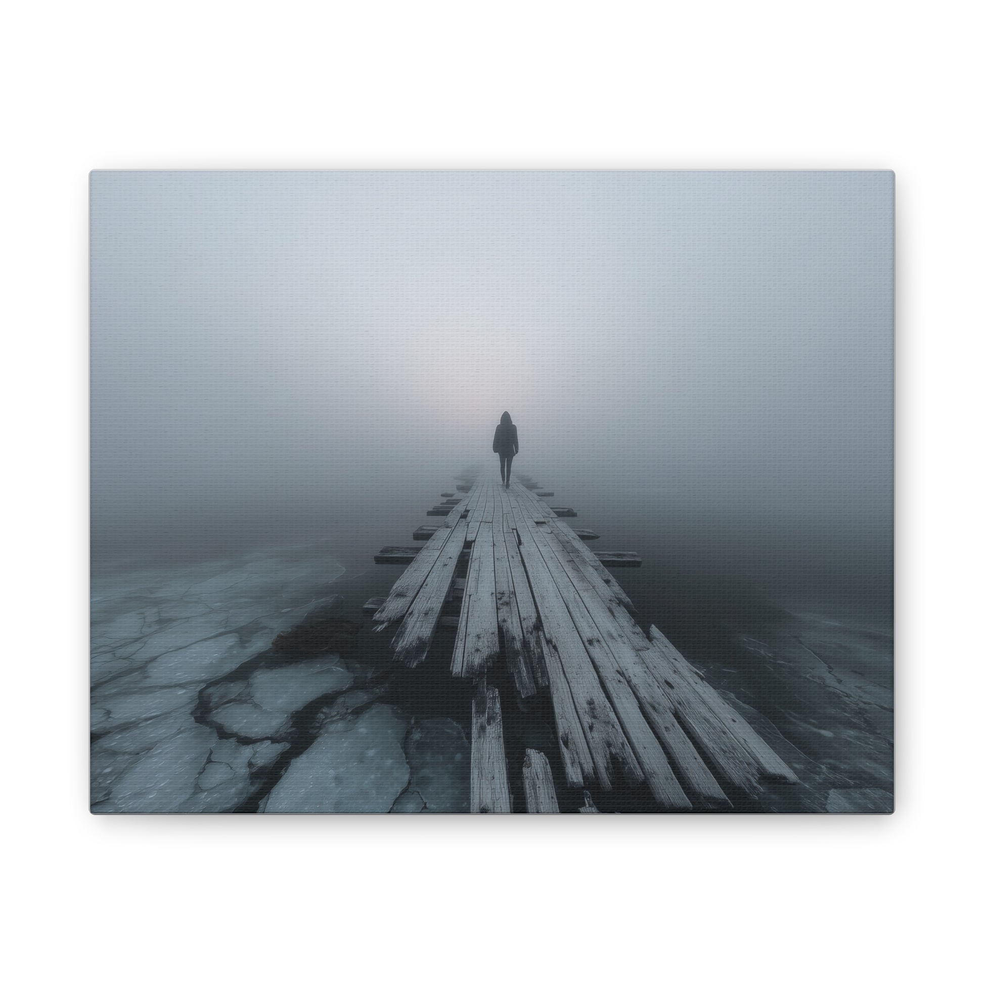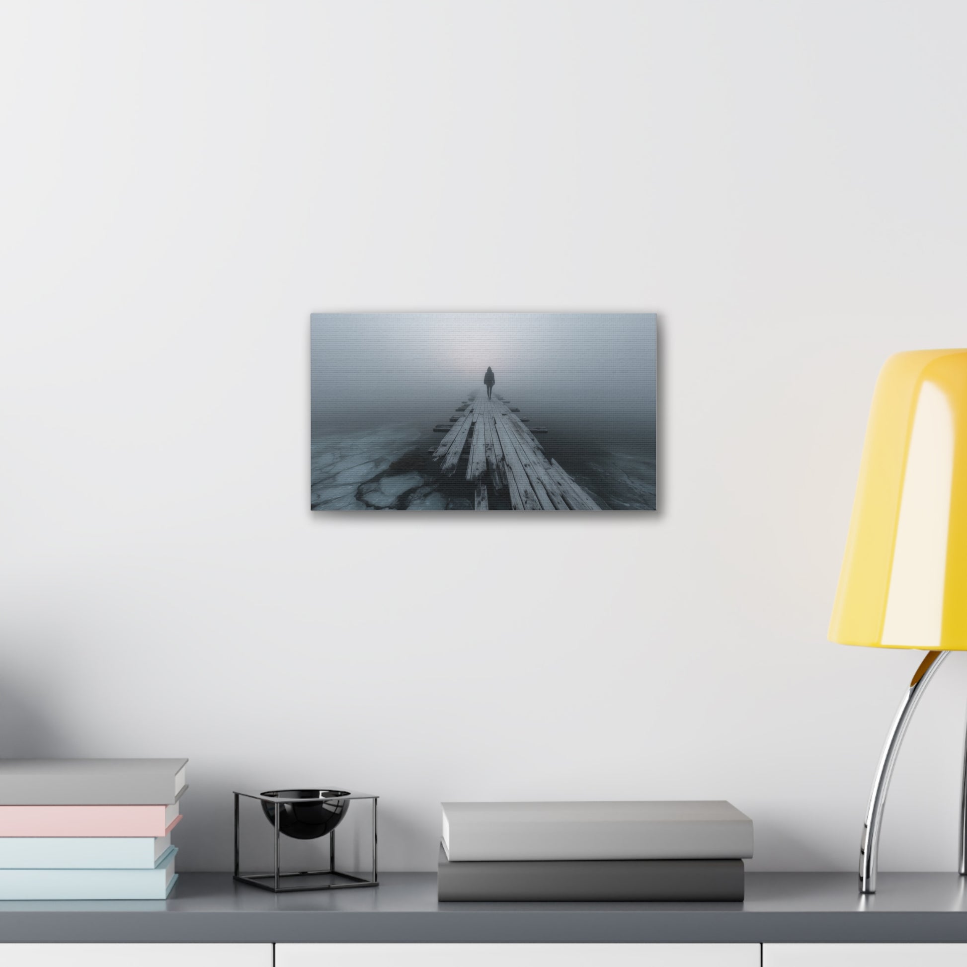 This atmospheric canvas artwork captures a solitary figure standing at the end of a weathered pier disappearing into thick, dreamlike fog. The cracked earth, muted tones, and surreal setting create a feeling of introspection, adventure, and calm all at once. Perfect for modern, minimalist, zen, or moody interior spaces, this piece instantly becomes a conversation starter. Its soft color palette and cinematic composition make it ideal for bedrooms, living rooms, meditation spaces, studios, or offices. Relevant for home decor, art enthusiasts, and those who appreciate unique and thought-provoking pieces. Great for gifting on birthdays, housewarmings, or as a special treat for yourself.