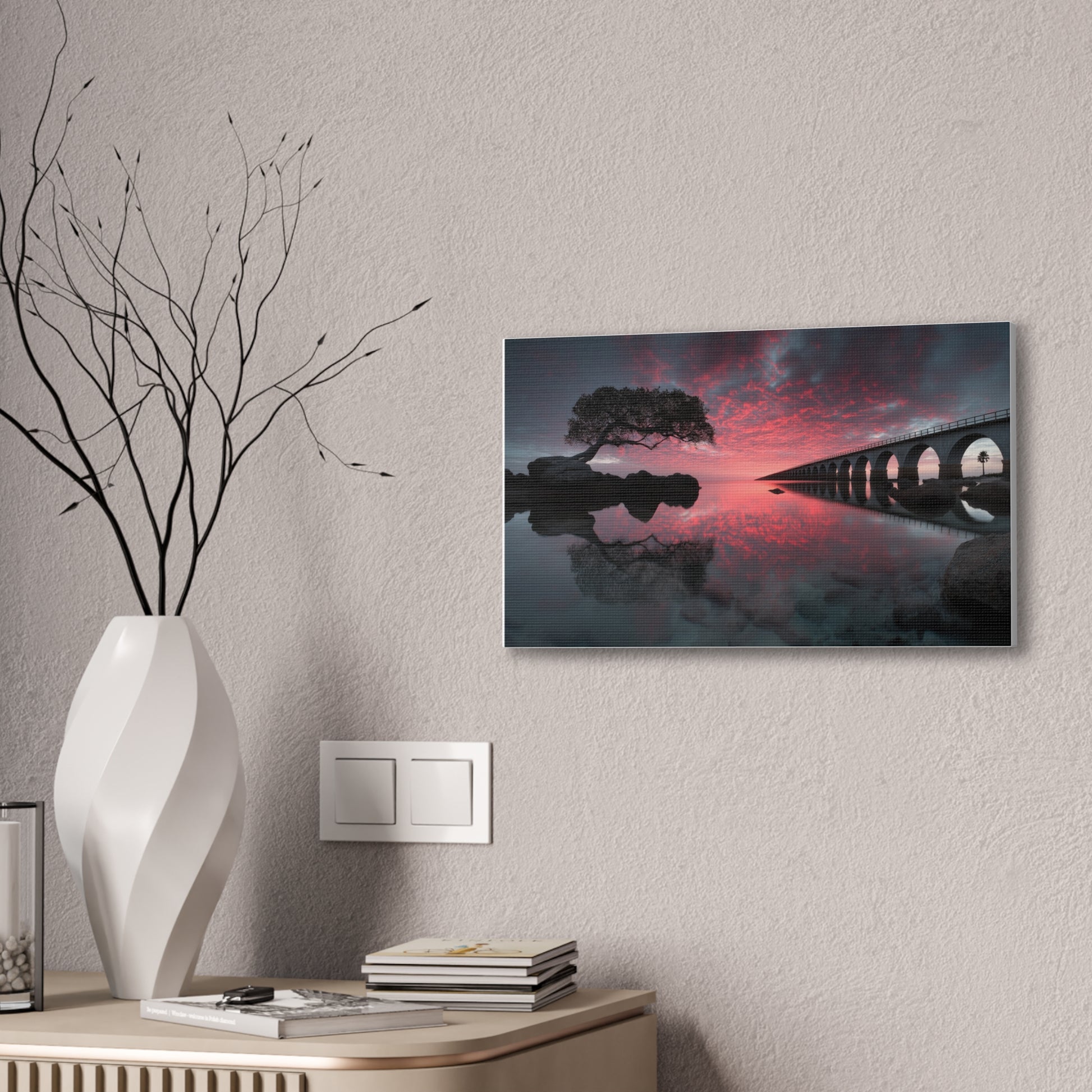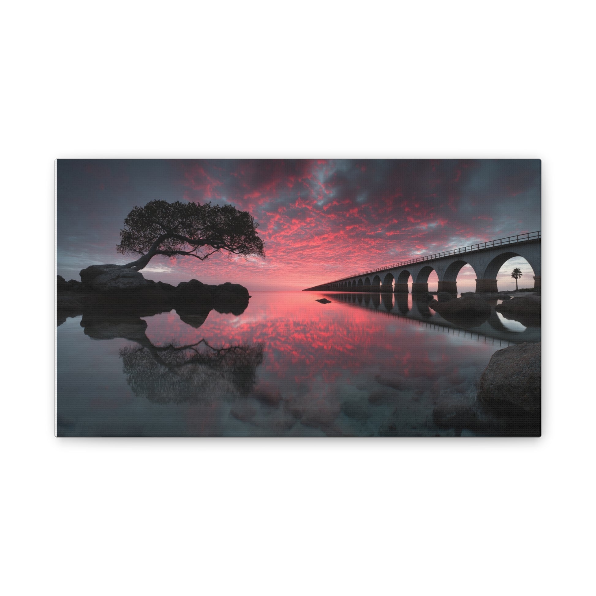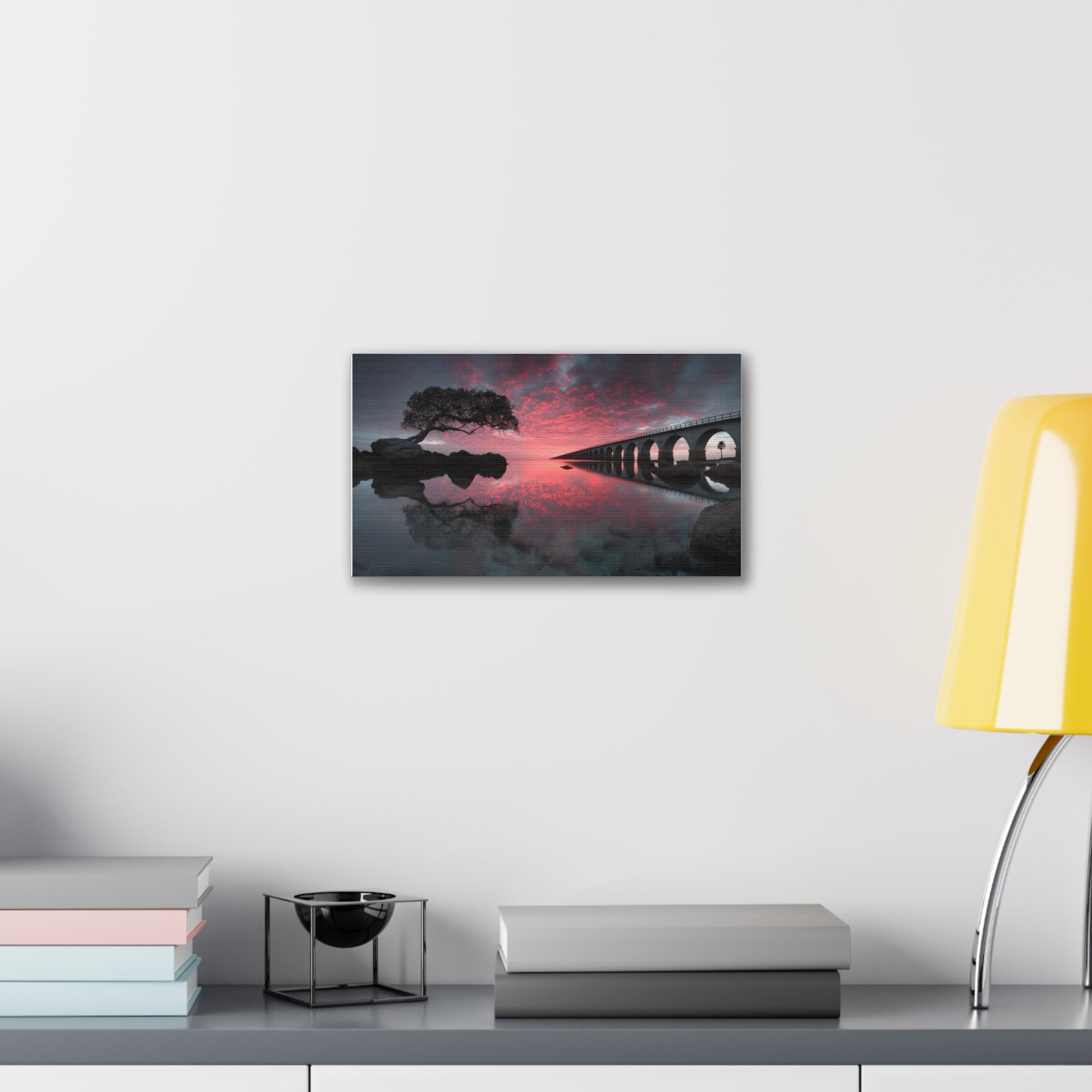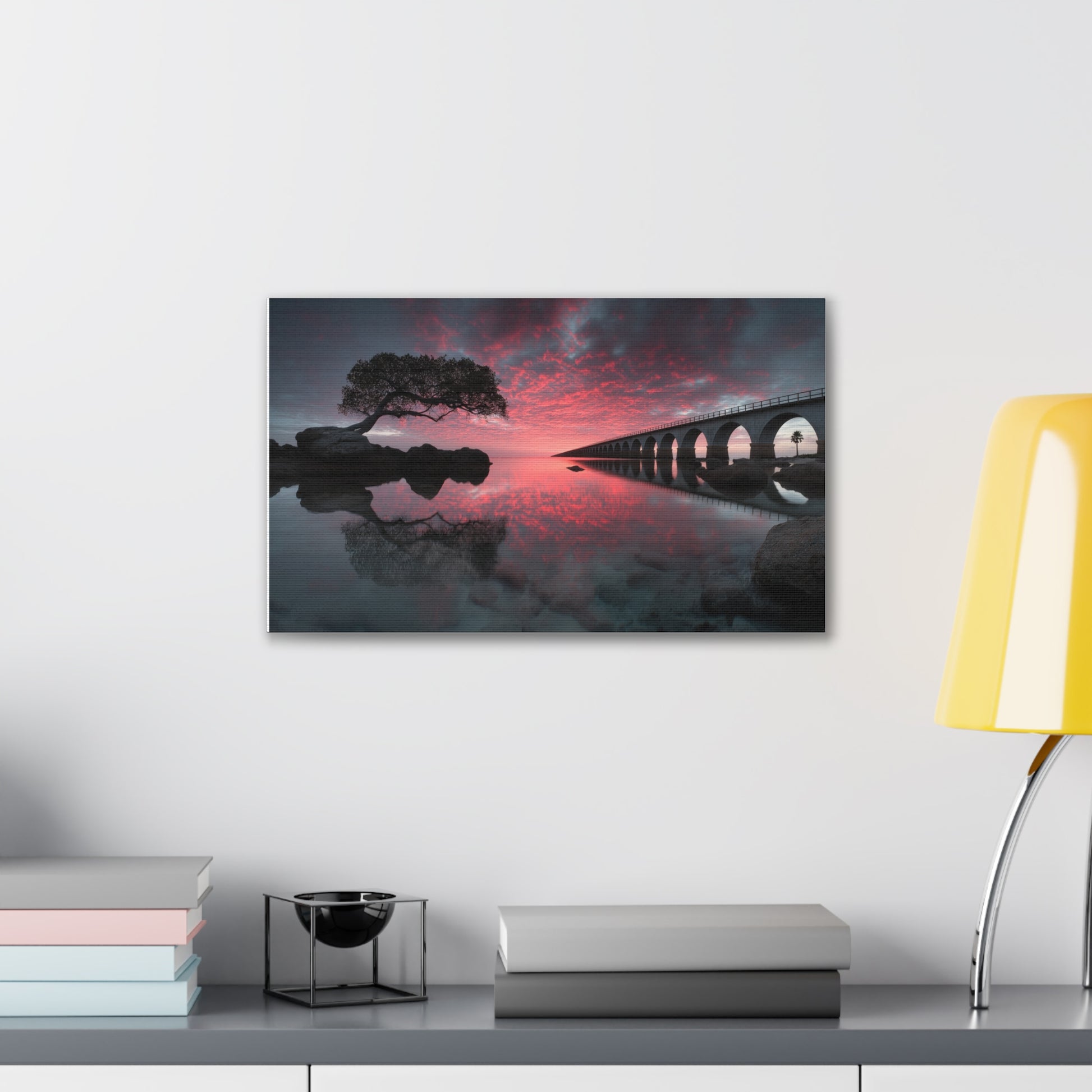 A large stretched canvas that brings a quiet, cinematic landscape into your room. The print captures a lone windswept tree and a sweeping arched bridge reflected in still water under a dramatic pink-and-indigo sky. Mounted on a slim 0.75" pine frame, the piece sits flush to the wall and reads like a window to a place where time slows. It’s subtle and bold at once — soft reflections, crisp details, and saturated colors create a mood that draws you in and holds attention. Hang it above a sofa, in a hallway, or over a bedside to introduce a contemplative focal point and deepen the room’s atmosphere.