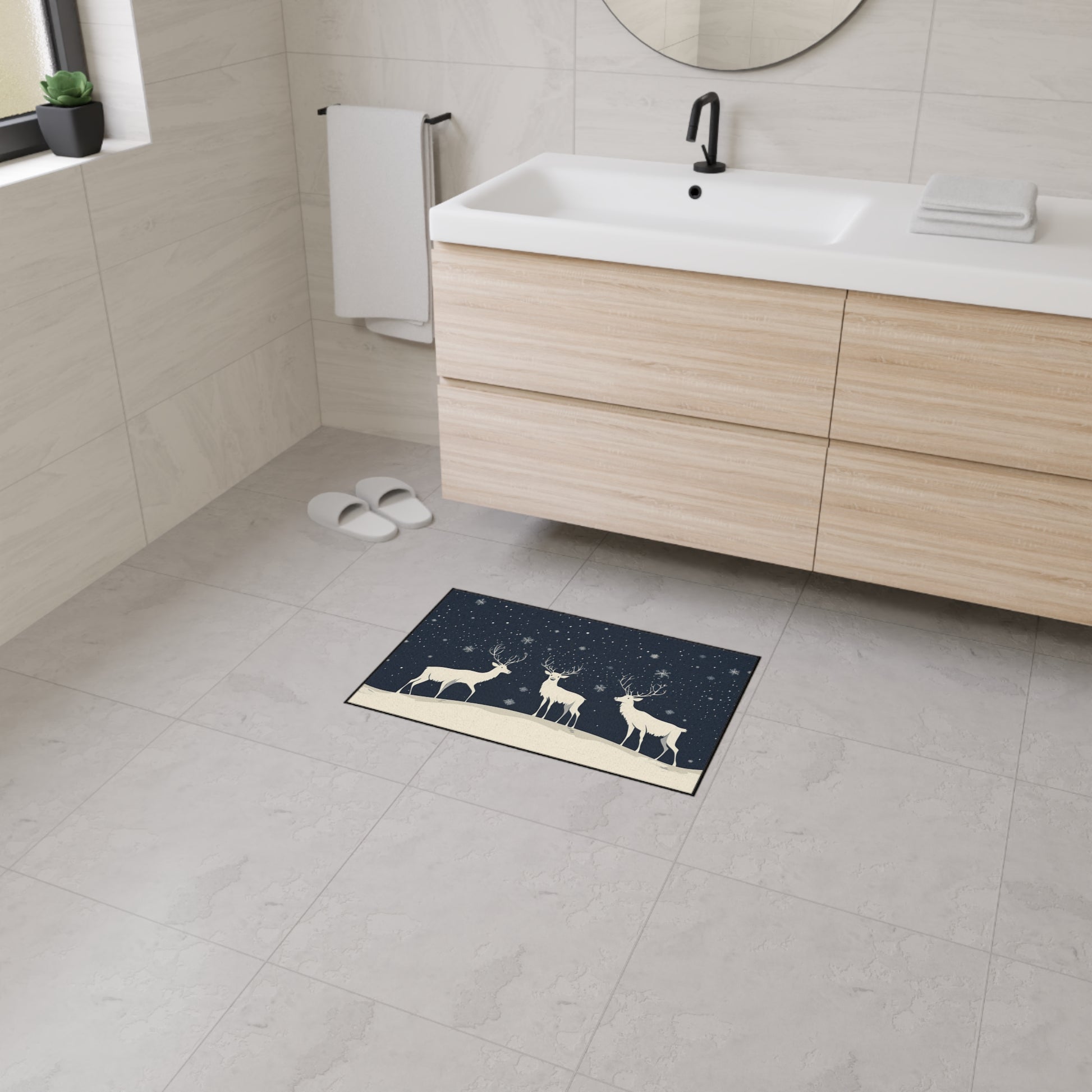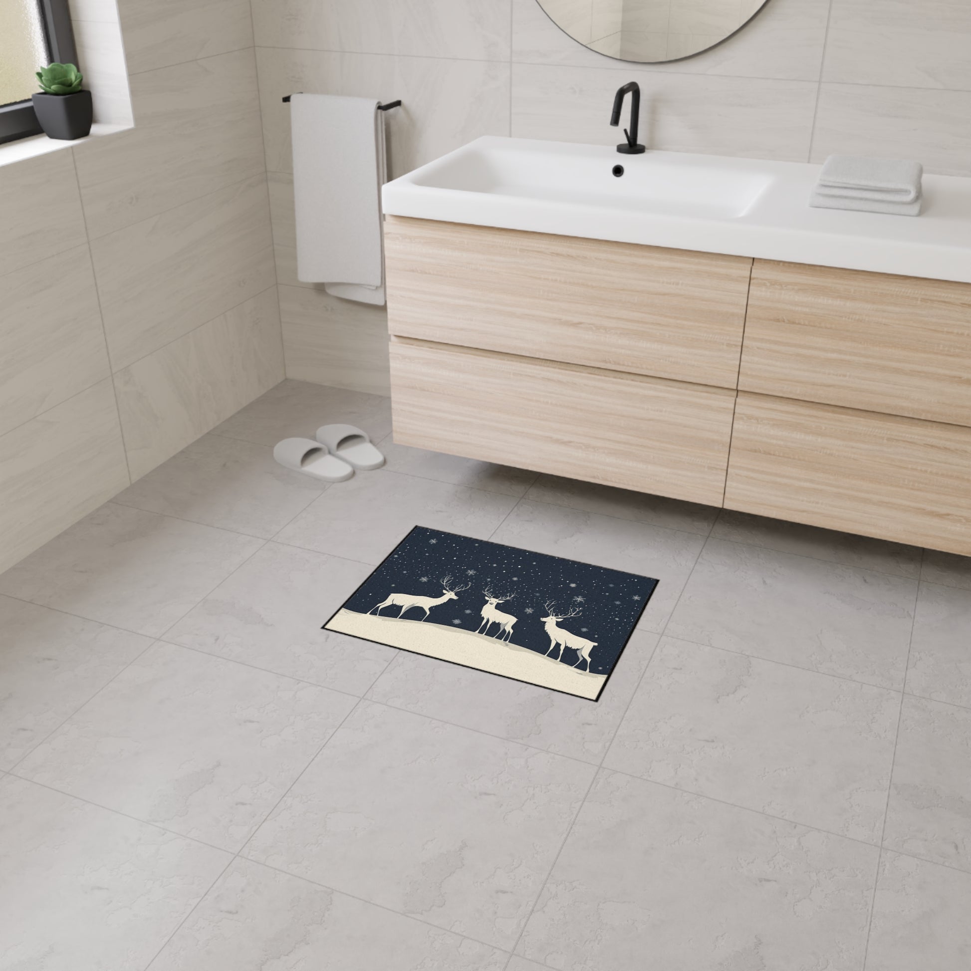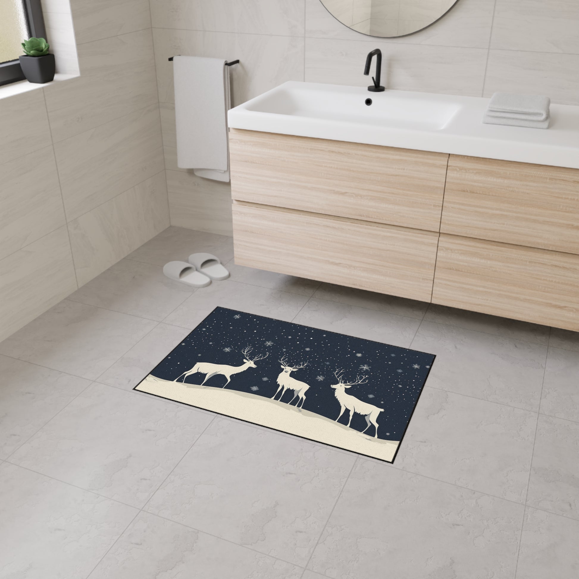 Lay down a quiet winter evening at your doorstep. This heavy-duty floor mat shows three graceful deer outlined against a deep navy, snow-dusted sky — the scene feels calm, slow, and a little enchanted. The dense polyester face holds the crisp, muted palette while a textured rubber back keeps the mat anchored under boots or slippers. It absorbs the first snowfall of the season and the small messes of everyday life without losing its soft, wintry charm. Place it by an entryway, in a mudroom, or beneath a bench to set a composed, woodland tone whenever you come home.